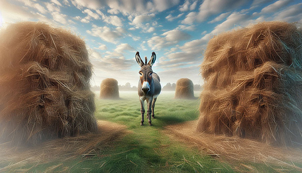 Picture this: a donkey — no ordinary donkey, but one blessed (or cursed) with perfect rationality. He’s plopped right in the middle of two identical piles of hay. Both equally green. Both equally fresh. Both equally chewable.